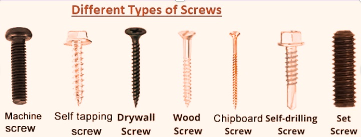 - Screws also come in different types, such as chipboard screws, particleboard screws, drive screws, hammer drive screws, eye screws, wood screws, and sheet metal screws.