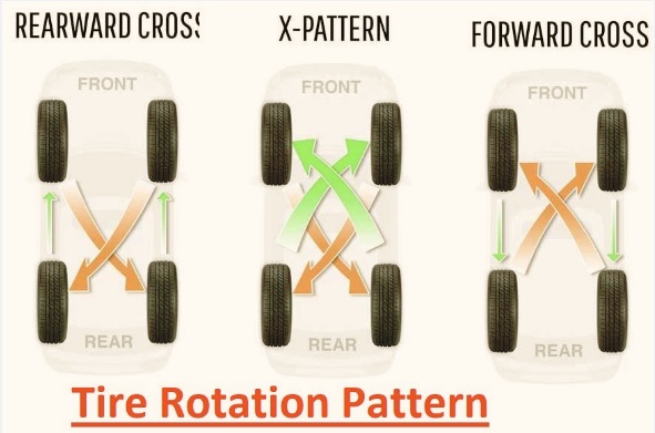 - car and other vehicles that come with rear-wheel drive vehicles, a rearward cross pattern used. The rear tires shift on the forward axle and exist on the same side of the vehicle, and the front tires shift to the opposite of the rear axle.