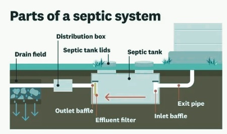 • In the above figure, you can see that there are many parts of the septic tank that help to continuously use the system without any problems.