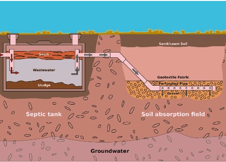 3. The wastewater leaves the tank and goes to the drain field. That is shallow, covered, and made in unsaturated soil. Pretreated wastewater is removed through piping on porous surfaces that help wastewater to move through the soil. Soil gets and disperses wastewater since it percolates in soil and discharges to the underground.