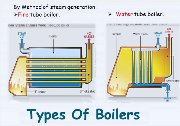 - The working of the boiler based on uses. such as hot water boilers used for heating water at homes and industries, and steam boilers produce steam for power production.